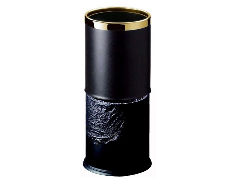 Dvojstenný izbový kôš s vonkajším plášťom z čiernej imitácie kože a vnútorným plášťom z čiernej lakovanej ocele. Kôš obsahuje aj "neviditeľné" vnútorné plastové vrecko, zlatý horný rám a nárazníkovú základňu.