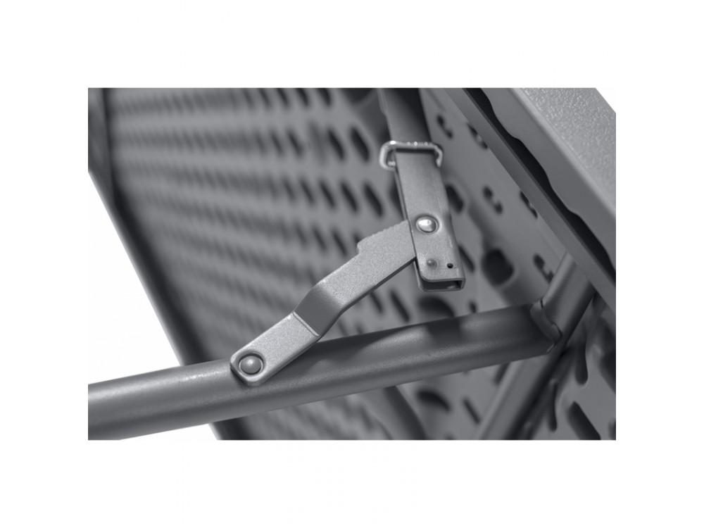Skladací banketový stôl PLANET 160 je vyrobený z ocele s práškovou povrchovou úpravou. Doska stola je vyrobená z polyetylénu s vysokou hustotou.