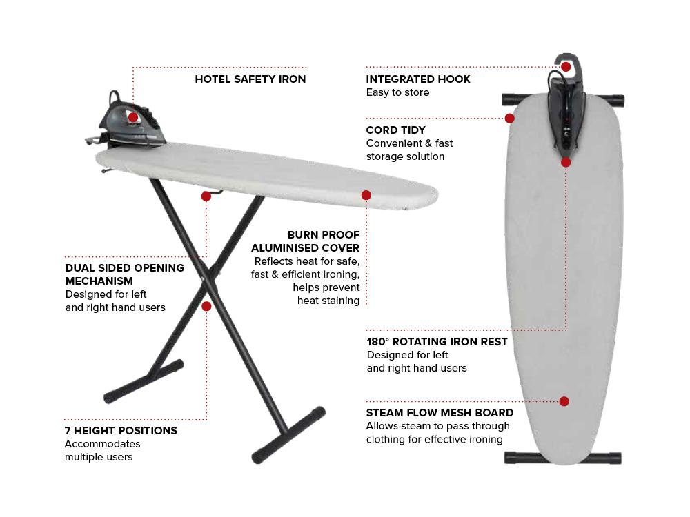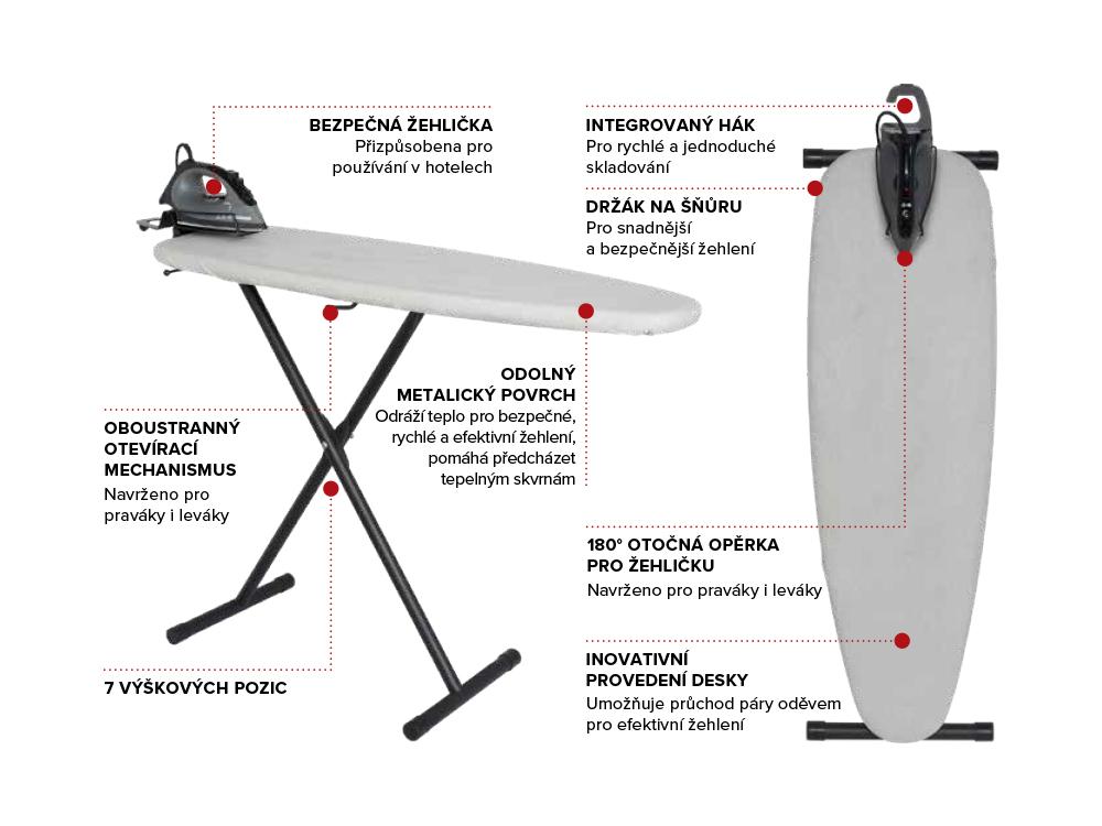 Žehliaca súprava CORBY v svetlosivej farbe sa skladá zo žehliaceho stojana (dosky) a suchej žehličky. Dĺžka kábla žehličky je 2 m a kábel je zafixovaný proti rozstrapkaniu. Žehlička je vybavená snímačom polohy a časovačom s 30-sekundovým horizontálnym a 8-minútovým vertikálnym nastavením.