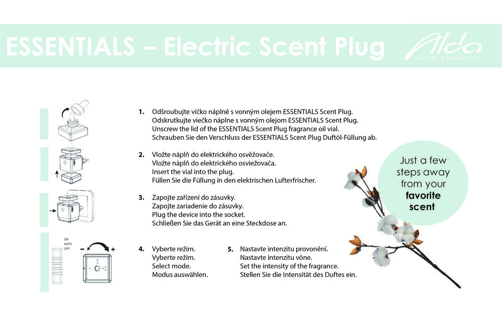 Ako používať: Vyberte si jakoukoli z 20 ml náplní z naší nabídky, vložte ji do difuzéru, zapojte do elektrické zásuvky a užívejte si příjemné aroma v jednom ze dvou režimů a až ve třech úrovních intenzity. Upozorňujeme, že výrobek je dodáván bez náplně. Pro intenzivnější zážitek je možné kombinovat s dalšími výrobky z řady Essentials z naší nabídky. Uchovávejte mimo dosah dětí. Pokud se náplň difuzéru střetne s kůží, okamžitě ji omyjte velkým množstvím vody a mýdla. Při zasáhnutí očí několik minut vyplachujte vodou.
