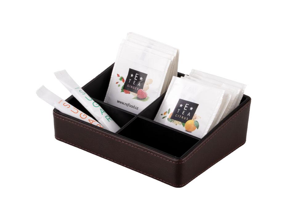 Zásobník ALDA Noble Leather je elegantný a praktický doplnok na prehľadné uloženie čaju, kávy, cukru alebo ďalších drobností. Vďaka viacerým oddeleným priehradkám pomáha udržať všetko usporiadané na jednom mieste a vyhotovenie v koženom vzhľade zároveň štýlovo dopĺňa hotelový interiér.